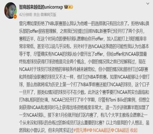 曾凡博正式放棄加盟澳洲NBL球隊的機會,目前給他留的去向只有回歸CBA,要么前往NCAA。