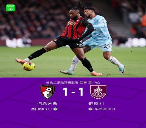 北京時間12月20日,英格蘭足球超級聯(lián)賽第17輪,伯恩茅斯主場迎戰(zhàn)伯恩利。比賽中,塞門約為伯恩茅斯打破僵局,取得領(lǐng)先。第90分鐘,愛德華茲傳中,布羅亞頭球破門幫助伯恩利扳平比分。最終雙方以1-1握手言和。