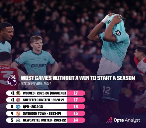 英超第17輪,狼隊(duì)主場(chǎng)0-2不敵布倫特福德,至此,狼隊(duì)本賽季前17輪比賽未嘗一勝,追平英超歷史開局最長不勝紀(jì)錄。