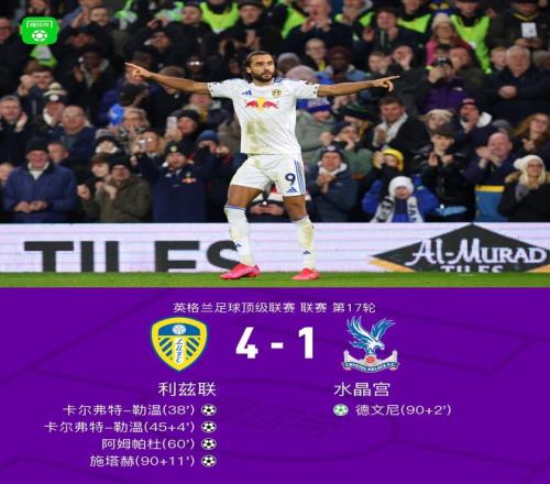 北京時間12月21日,英格蘭足球頂級聯(lián)賽第17輪,利茲聯(lián)坐鎮(zhèn)主場迎戰(zhàn)水晶宮。比賽中,卡爾弗特-勒溫率先破門,為利茲聯(lián)取得領(lǐng)先。隨后比約爾送出助攻,卡爾弗特-勒溫再入一球,完成個人梅開二度。易邊再戰(zhàn),阿姆帕杜接隊友配合后攻入一球,進(jìn)一步擴(kuò)大比分優(yōu)勢。水晶宮由德文尼通過點球扳回一分。比賽最后階段,施塔赫抓住機(jī)會再下一城,鎖定勝局。最終全場比賽結(jié)束,利茲聯(lián)以4比1戰(zhàn)勝水晶宮。