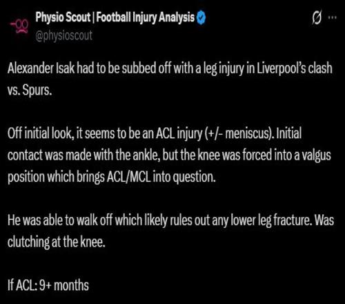 來到利物浦之后,伊薩克在所有比賽中僅打進三球,并且在本賽季早些時候因腹股溝問題缺席了一段時間?,F(xiàn)如今,伊薩克再次遭遇膝蓋重傷,也讓他的賽季前景蒙上了一層陰影。若如足球傷病分析博主Physio Scout所言,伊薩克很可能已經(jīng)提前賽季報銷。