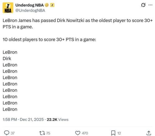 除此之外,40歲355天的詹姆斯超越40歲294天的諾維茨基,成為NBA歷史上單場(chǎng)砍下30+得分年齡最大的球員。