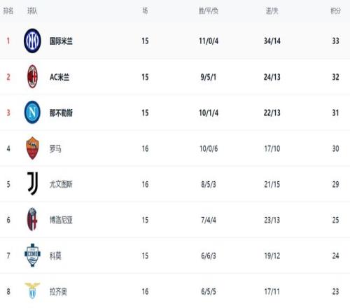 在積分榜上,國際米蘭排名榜首。國際米蘭11勝4負(fù),拿到33分。排名第2的是AC米蘭。AC米蘭9勝5平1負(fù),拿到32分,只比國際米蘭少1分。第3名的是那不勒斯,拿到31分。輸球的羅馬依然是30分,排名第4。尤文圖斯贏球之后,總積分達(dá)到29分,排名第5,只比羅馬少1分,下一輪有可能殺入歐冠區(qū)。博洛尼亞以25分排名第6。法布雷加斯率領(lǐng)的科莫以24分排名第7。拉齊奧23分排名第8。