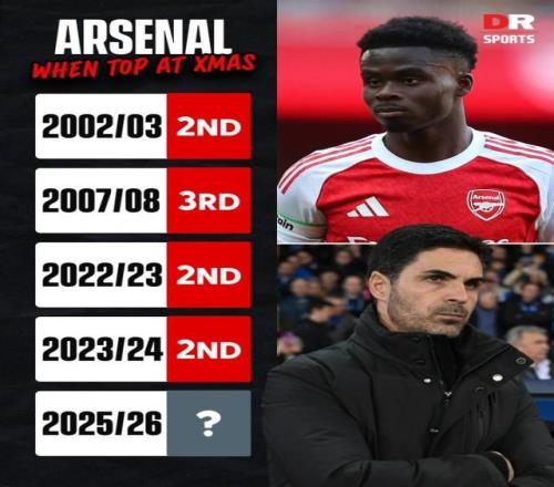 阿森納1比0小勝阿爾特塔老東家埃弗頓,繼續(xù)領(lǐng)先曼城2分領(lǐng)跑英超積分榜。這是阿森納第5次以圣誕冠軍身份領(lǐng)跑,然而前4次都沒能最終奪冠(2002-03亞軍、2007-08季軍、2022-23亞軍、2023-24亞軍),其中前2次是被曼聯(lián)逆轉(zhuǎn)奪冠,后2次是被曼城逆轉(zhuǎn)奪冠。 若算上老英甲時(shí)代,槍手還有3次成為圣誕冠軍卻沒能最終捧起獎(jiǎng)杯,分別是1951-52季軍、1986-87殿軍、1989-90殿軍。