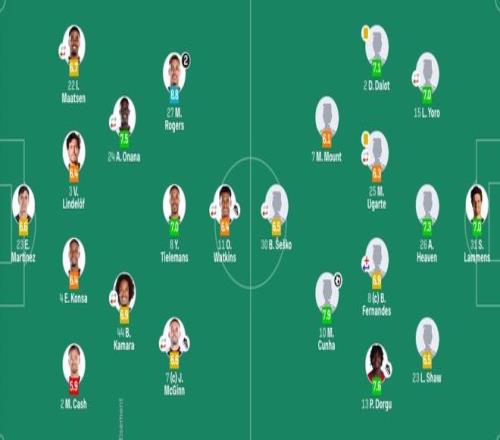 阿斯頓維拉首發(fā):23-大馬丁、3-林德洛夫、4-孔薩、2-卡什、22-馬特森(75'12-迪涅)、24-奧納納(84'10-布恩迪亞)、8-蒂萊曼斯、27-羅杰斯、44-卡馬拉(88'26-博加德)、7-麥金(84'29-蓋桑)、11-沃特金斯(75'17-馬倫)